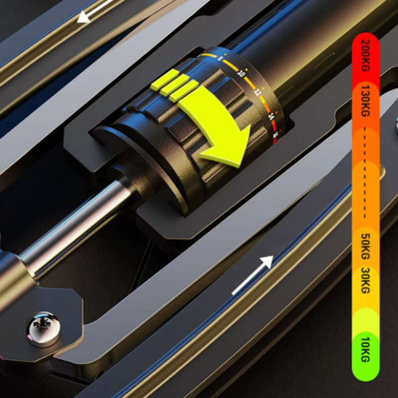 Resistencia 10-200kg • Sistema de micro-rebote • Estructura triangular • Acero resistente • Contador • Empuñadura ergonómica