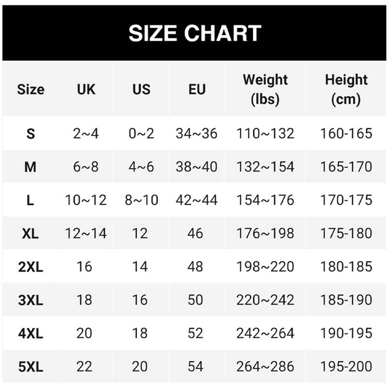 Talla: S, M, L, XL, 2XL, 3XL, 4XL, 5XL.