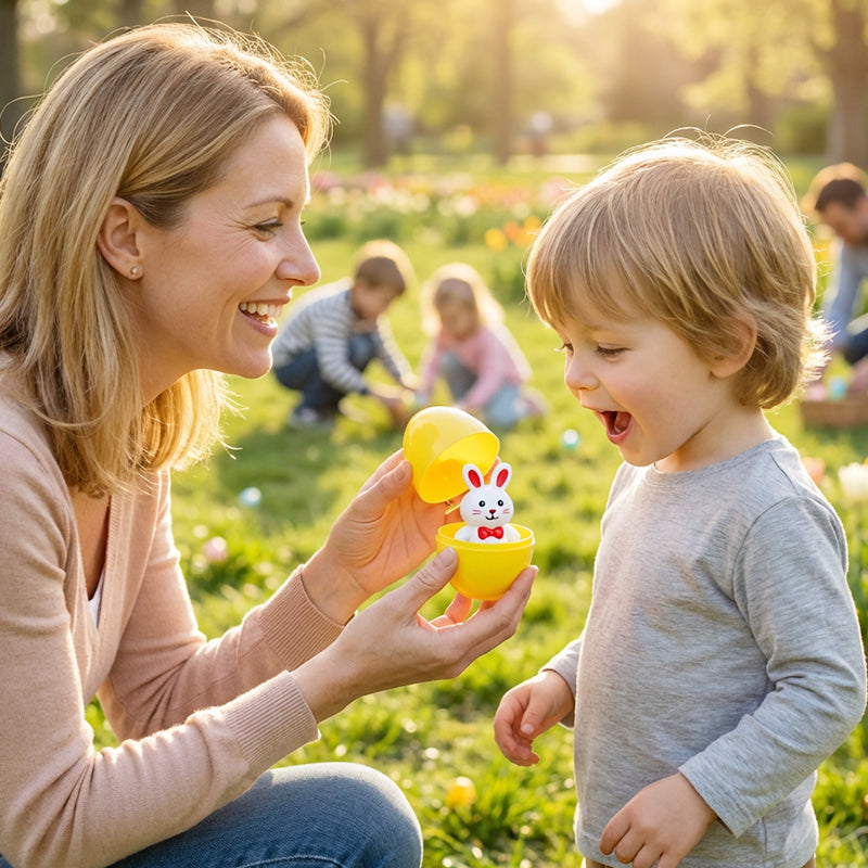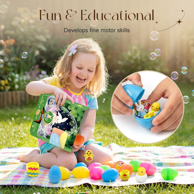 DIVERSO SURTIDO DE JUGUETES: deleite a los niños con una amplia variedad de juguetes de alta calidad. La colección incluye conejitos de cuerda, lindos pollitos, sellos y más, lo que garantiza que cada huevo revele un tesoro único y emocionante.
