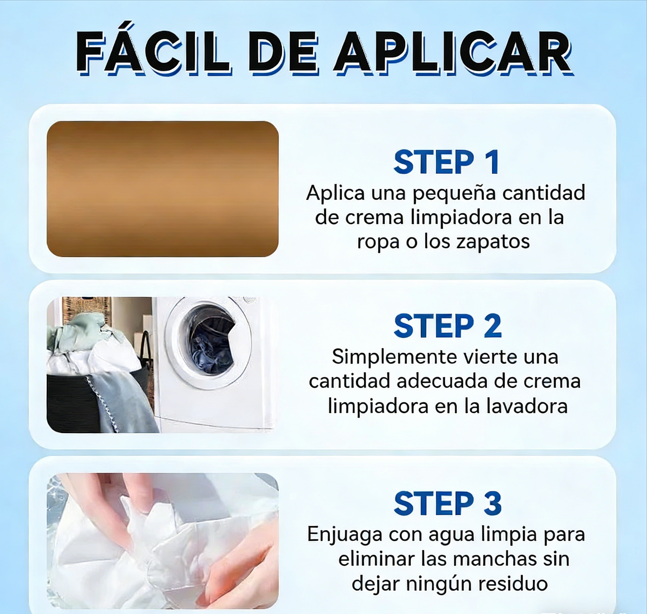 POTENTE ELIMINADOR DE MANCHAS – Elimine las manchas difíciles con confianza. Esta pasta limpiadora utiliza una fórmula de acción rápida que penetra profundamente en los tejidos y superficies, eliminando eficazmente las manchas amarillentas, de aceite, vino, moho y fruta. Ya se trate de viejas marcas de sudor en las camisas o de suciedad en los zapatos, ofrece resultados visibles sin dañar los materiales.