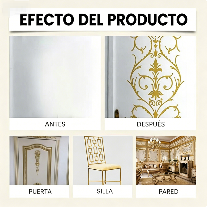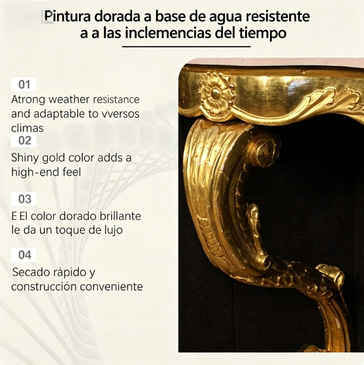 IMPRESIONANTE ATRACTIVO DECORATIVO : Realza al instante cualquier objeto con un toque de opulencia. Esta pintura ofrece un efecto dorado intenso y brillante que añade una sensación de lujo, transformando objetos comunes en piezas llamativas.