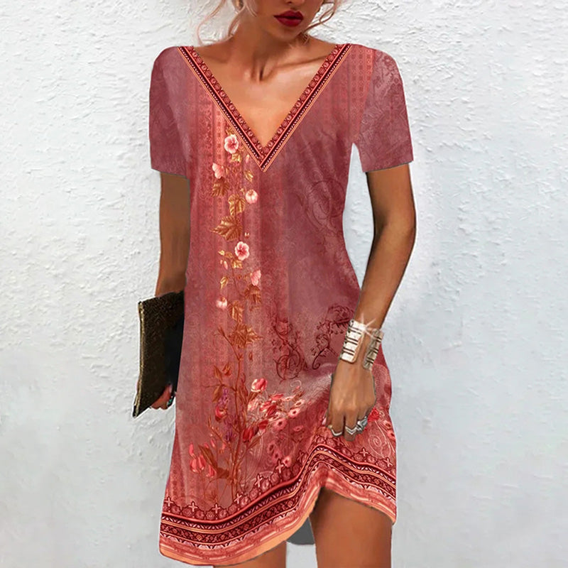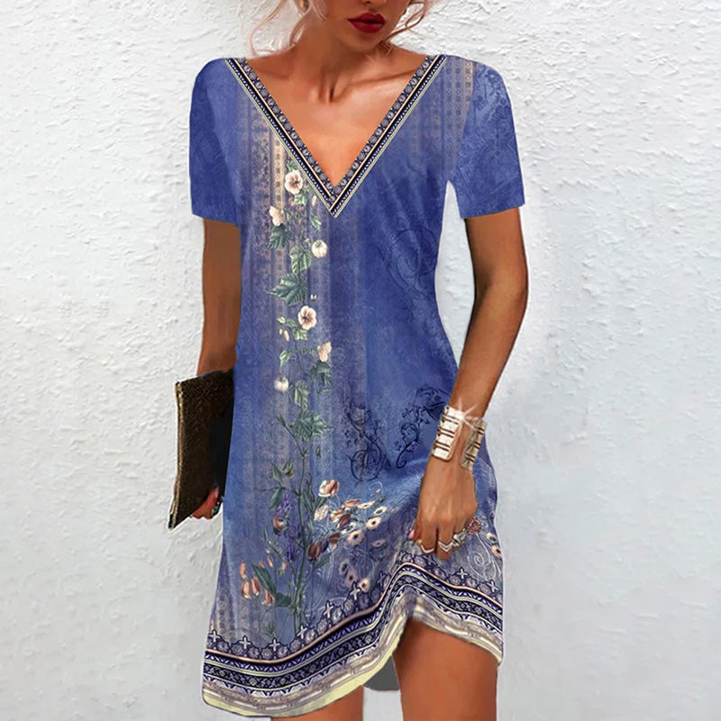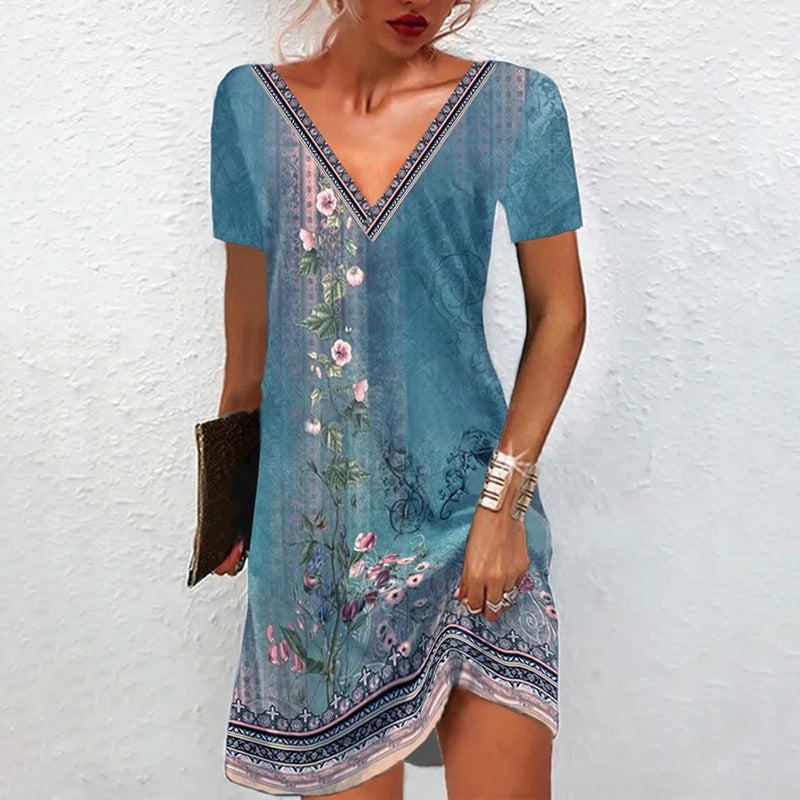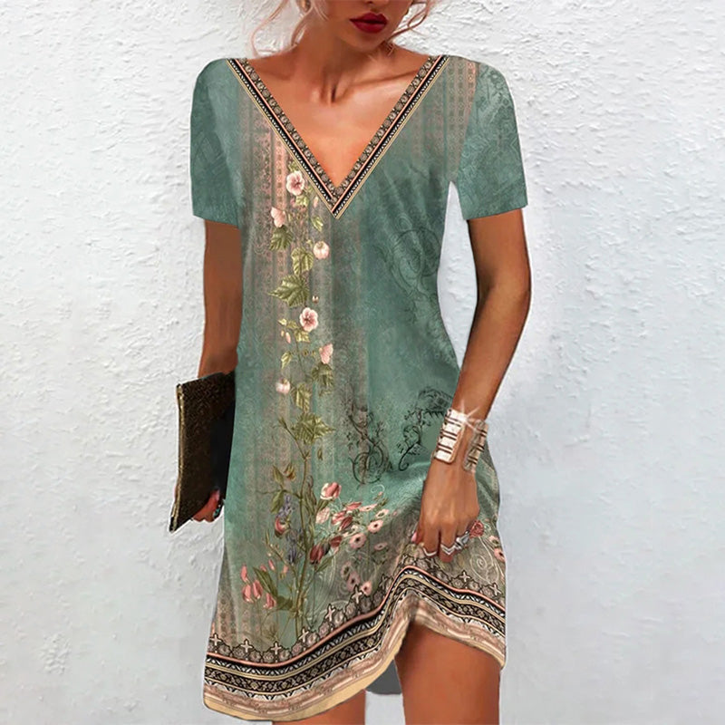 1 x Vestido Casual de Manga Corta con Cuello en V Estampado