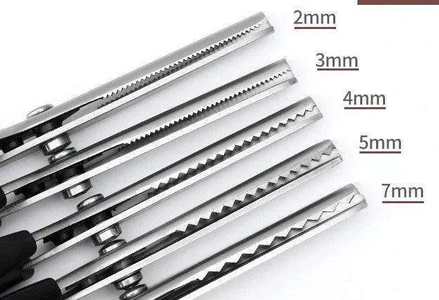 - TIJERAS DE ZARZA VERSÁTILES : Las hojas afiladas son dentadas y dejan un patrón en zigzag a medida que corta, el patrón dentado puede limitar la longitud del hilo deshilachado de los bordes de tela sin pescar y así minimizar el daño.