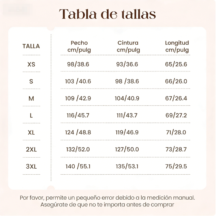 Talla: XS, S, M, L, XL, 2XL, 3XL.