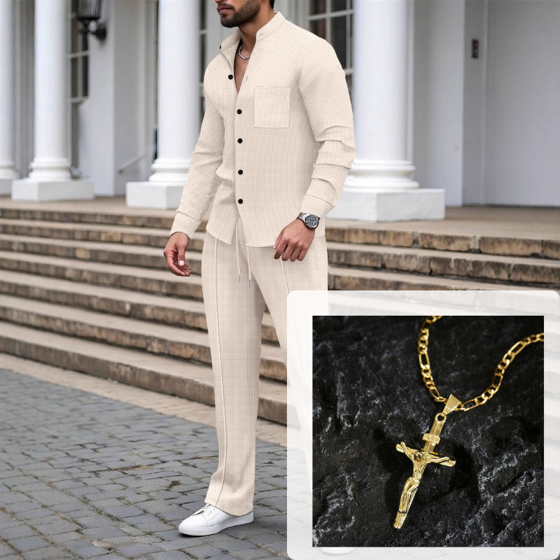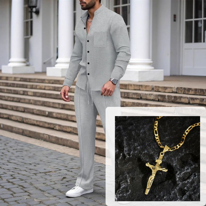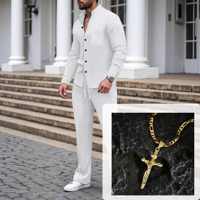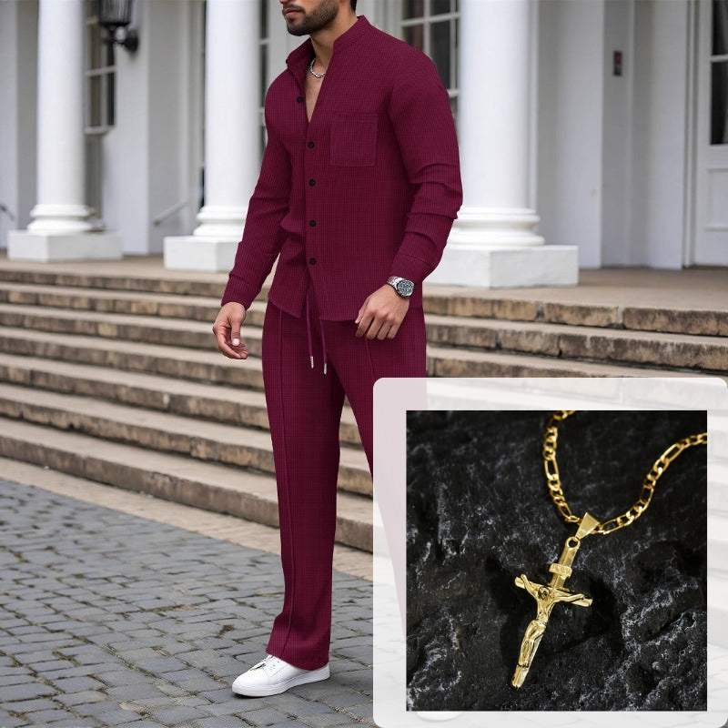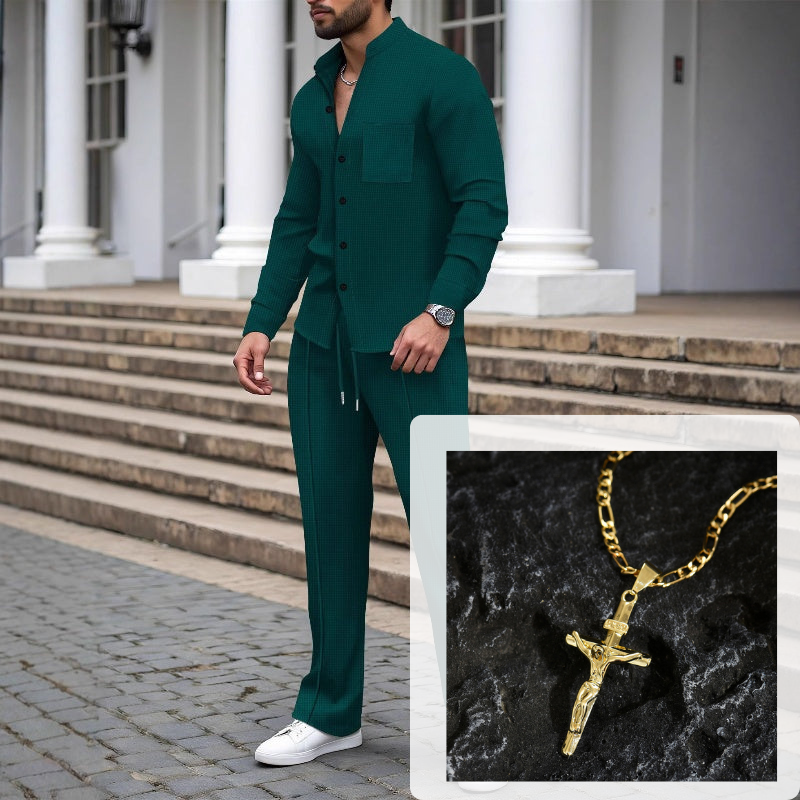 👕 Conjunto de Dos Piezas para Hombre 👖 Camisa y Pantalón Informales de Tejido Gofrado 🌟 Estilo y comodidad para cada ocasión ✨