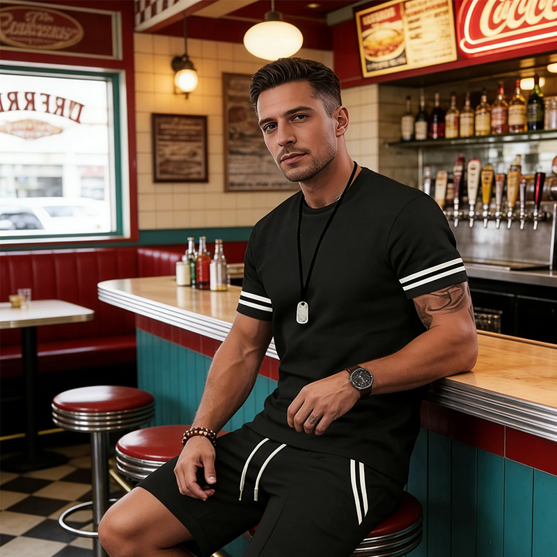 El paquete incluye: 1 * Conjunto de 2 piezas para hombre (camiseta a rayas y pantalones cortos)