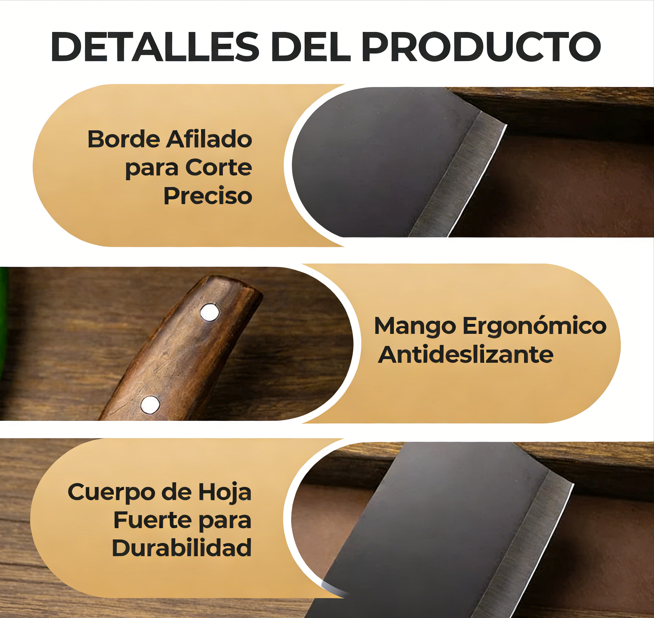 MANGO ERGONÓMICO ANTIDESLIZANTE: Diseñado para ofrecer seguridad y comodidad, el mango texturizado evita que se resbale incluso cuando está mojado. Su forma contorneada reduce la fatiga de la mano durante un uso prolongado, lo que lo hace ideal tanto para cocineros aficionados como para profesionales. Se acabó el esfuerzo: ahora podrá cortar con suavidad y control.