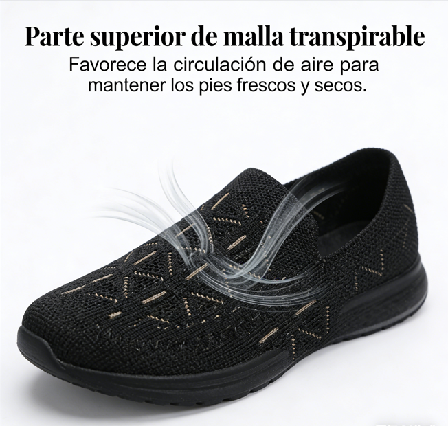 PARTE SUPERIOR DE MALLA TRANSPIRABLE – Mantén tus pies frescos y secos durante todo el día. El material está recubierto con una fina malla que garantiza una excelente circulación del aire, para que tus pies no suden y disfrutes de la máxima comodidad incluso tras un uso prolongado.