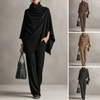 El paquete incluye: 1 conjunto de capa con cuello vuelto y pantalones anchos para mujer.